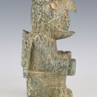 A pre-Columbian style carved green hardstone eagle warrior figure, possibly Aztec civilization, modelled in a seated position and wearing an eagle headdress, height 23.5cm, width 13.5cm. Provenance: from the estate of a West Sussex collector.