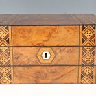 A late Victorian walnut and parquetry banded workbox, height 14.5cm, width 30cm, together with another walnut box, height 14cm, width 27.5cm, depth 20cm.