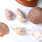 A selection of seashells and coral specimens, including a large conch, mounted as a table lamp, and another mounted with a group of smaller shells and coral, on an oval base.