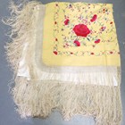 A Chinese silk shawl, embroidered in polychrome threads with peacocks and flowers, 117cm x 117cm, within a long cellular fringed border, together with another similar shawl, embroidered with flowers.