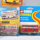 Six Corgi Juniors buses, all in carded bubble packs, a No. 468 London Transport Routemaster bus, boxed, two further Routemaster buses, a Corgi Toys Riley Husky Ford Thames van, a Corgi Toys Ferrari Berlinetta and a Corgi Rockets Eldorado (playwear and faults, one bubble pack opened, creases and scuffs).