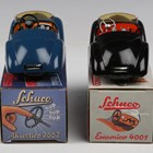 A modern Schuco Akustico 2002 car and an Examico 4001 car, both boxed with keys and instructions.