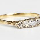 A gold and diamond five stone ring, mounted with a row of variously cut diamonds between scrolled shoulders, unmarked, weight 2.6g, ring size approx T.