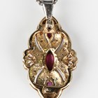 A 9ct gold, ruby and diamond pendant of foliate design, as converted from a brooch, import mark London 1988, length 2.9cm, fitted to a 9ct white gold faceted curblink neckchain, length 46cm, and a pair of 9ct gold earstuds in a similar design, total weight 8.1g.