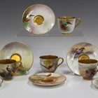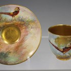 Eight assorted gilt lined Royal Worcester cabinet cups and saucers, 1919 to 1930, comprising an example painted with a kingfisher, signed Powell, one with ducks, signed Jas Stinton, one with a peacock, signed Austin, an exotic pheasant, signed by Sedgley, three others with pheasants, each signed by Jas Stinton, and a cup by Jas Stinton, painted with pheasant, matched with a saucer painted with pine by Austin, puce printed marks to bases (minor faults).