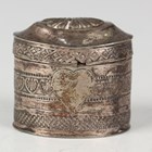 An early 19th century Dutch silver nutmeg grater of oval form with engraved decoration, the hinged lid revealing a steel grate, height 3cm, together with a Dutch silver box, the hinged lid revealing a cotton reel holder, height 4.7cm, and a Continental silver spoon with figural finial, length 19.5cm.
