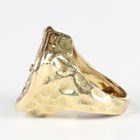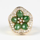 A gold, jade and diamond ring in a cinquefoil floral design, mounted with five oval jade cabochons, otherwise set with circular cut diamonds, detailed '14K SGS', ring size approx Q, with a box.