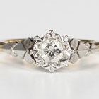 A gold and diamond single stone ring, mounted with a circular cut diamond in a raised setting between decorated shoulders, detailed '18ct', weight 2.8g, ring size approx I1/2.