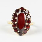 A gold and garnet oval cluster ring, claw set with the principal oval cut garnet within a surround of circular cut garnets, detailed '585', weight 4.8g, ring size approx O1/2.