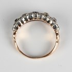 A gold, silver set and diamond ring in the Georgian taste, mounted with a row of five principal cushion cut diamonds at the centre within an openwork surround, further set with cushion cut diamonds, unmarked, weight 5.2g, ring size approx M, with a case.