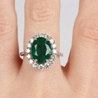 A white gold, emerald and diamond cluster ring, claw set with the large oval cut emerald within a surround of circular cut diamonds, with diamond set shoulders, detailed '18K', weight 5.2g, total emerald weight approx 5.53ct, total diamond weight approx 1.37ct, ring size approx N.