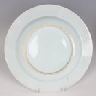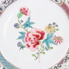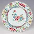 A pair of Chinese famille rose export porcelain plates, Yongzheng period, each painted with a central peony and flower spray within a rim of further flowers, diameter 22.5cm (one with starcrack, the other with wear to enamels), together with another famille rose plate, Yongzheng period, painted with flowers emanating from rocks within a floral and whorl rim, diameter 22.6cm.