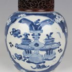 A Chinese blue and white porcelain ginger jar, Kangxi period, of ovoid form, painted with opposing panels of precious vessels and objects, reserved against a prunus and cracked ice ground, height 16.6cm, with carved and pierced hardwood cover.