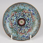 A Chinese cloisonné bowl, 19th century, of steep-sided circular form, the exterior decorated with polychrome lotus and scrolling tendrils framing shou medallions, height 7.3cm, diameter 12.1cm (some enamel loss to interior and foot), together with a similarly decorated circular dish, diameter 11.1cm.