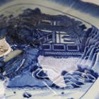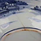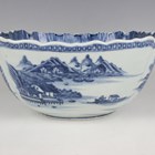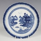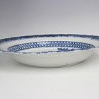 A Chinese blue and white export porcelain part dinner service, late Qianlong/early Jiaqing period, each piece painted with pavilions, figures, trees and boats in a coastal landscape within a feathered rim, copied from a standard English creamware design, comprising a square fruit bowl, width 26.5cm, a pair of oval tureens and covers, lengths 40cm, an oval meat dish, length 47cm (rivet repaired), three saucer dishes, diameters 24cm, four dinner plates, diameter 24.4cm, and eleven soup plates, diameter 24.4cm (faults and repairs). Note: a dish of the same pattern is illustrated by Geoffrey A. Godden in 'Oriental Export Market Porcelain...', 1979, page 155, No. 65.