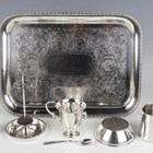A George V silver hatpin and ring stand, on a circular dish base, Birmingham 1912 by S. Blanckensee & Son Ltd, height 16.5cm, together with a small group of other silver, comprising two christening mugs, both with engraved inscriptions, hatpin stand, teaspoon and pepper caster, weighable items 245.4g, and a plated rectangular dressing table tray, length 33.5cm.