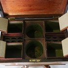 A Regency figured mahogany and ebony inlaid teapoy, the sarcophagus caddy top enclosing four canisters above a pair of angular supports and inlaid downswept legs, height 75cm, width 57cm, depth 36cm.
