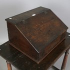 A 17th century oak bible box, the hinged sloping lid enclosing three drawers, width 53cm, depth 39cm, together with a 17th century oak side table, height 70cm, width 82cm, depth 52cm.