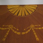 A pair of modern reproduction mahogany demi-lune side tables with bellflower and fan patera inlay, height 76cm, width 75cm, depth 39cm.