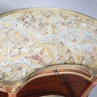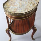 A 20th century French stained beech and gilt metal mounted two-tier table with an inset marble top and single frieze drawer, height 76cm, width 70cm, depth 43cm.