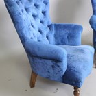 A pair of modern Victorian style armchairs, upholstered in buttoned royal blue velour, height 88cm, width 70cm, depth 74cm.