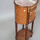 An early 20th century French parquetry kingwood oval bedside cabinet with gilt metal mounts and inset marble top, height 85cm, width 45cm, depth 34cm (marble damaged).