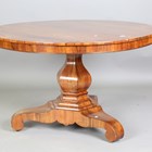 A mid-19th century walnut and foliate inlaid tip-top breakfast table, raised on a triform base, height 74cm, diameter 122cm.
