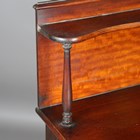 A mid-Victorian mahogany chiffonier, height 119cm, width 109cm, depth 45cm, together with a 20th century walnut writing table, the top inset with leather above a single end drawer, height 75cm, width 84cm, depth 45cm.