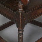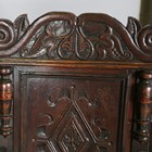 A pair of 17th century provincial oak Wainscot armchairs with carved panel backs and solid panel seats, height 120cm, width 58cm (some alterations and restoration).