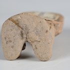 A pre-Columbian pottery mask, width 7.5cm, mounted on a wooden base, together with a pre-Columbian pottery figure, bearing label to reverse, height 6cm.