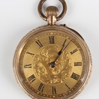 A Rotary 9ct gold circular cased lady's wristwatch, the signed dial with black Arabic numerals, subsidiary seconds and blued steel hands, Chester 1943, fitted to a 9ct gold woven mesh link bracelet, the foldover clasp Birmingham 1958, weight 15.6g, case width 2.1cm, together with a keyless wind open-faced lady's fob watch, case diameter 3.3cm (the gold case back lacking).