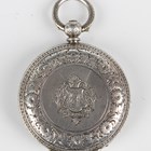 A Mappin 9ct gold circular cased lady's wristwatch with unsigned jewelled movement, the signed dial with Arabic numerals, import mark Glasgow 1923, case diameter 2.4cm, fitted to a black ribbon strap, cased, together with a silver cased keywind open-faced lady's fob watch with cylinder movement, the case detailed 'Fine Silver', case diameter 3.7cm, with a key, and a colourless paste brooch watch, the dial with gilt Arabic numerals and baton hour markers and detailed 'Hermes'.