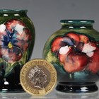 Two miniature Moorcroft pottery vases, second half 20th century, the first of baluster shape, decorated with pansy against a shaded blue/green ground, height 5cm, the second of spherical shape, decorated with hibiscus, height 4.5cm, blue printed factory marks to each base.