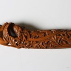 A late 19th/early 20th century Swedish nobleman's hunting knife with single-edged blade with clipped-back point, blade length 16cm, S-shaped silver guard with dog head finials and carved sandalwood grip with all-over deep foliate decoration and shield with trophies of arms, surmounted by a Norse-type warrior's head and carved lion pommel, with trigger-button-release silver-mounted sandalwood scabbard, hallmarked 'M.A.L. 830 S', with all-over deep foliate carved decoration.