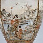 A Japanese Satsuma earthenware vase, Meiji period, the urn-shaped body painted and gilt with panels of figures and landscapes, beneath a narrow neck filled with simulated brocade, indistinct black and gilt signature to base, possibly Kinsei Kiowa, height 25cm.