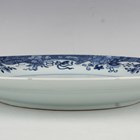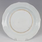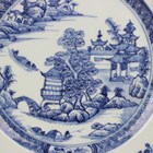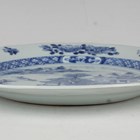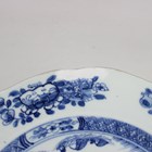 A Chinese blue and white export porcelain circular dish, Qianlong period, the centre painted with peony and prunus, within a foliate rim, diameter 32cm (hairlines and rim chips), together with a set of three Chinese blue and white export porcelain plates, each painted with a coastal landscape, with shaped rim, diameters 23cm (minor rim chips and two with hairlines).