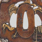 A Japanese brown patinated bronze and shibuichi oval tsuba, Meiji period, each side cast and pierced with gilt cranes between silver clouds and stream, one side signed, length 7.8cm, with pine case. Provenance: local private collection.