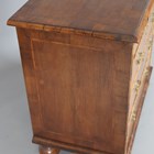 A Queen Anne 18th century style walnut chest with cross and feather banded decoration, fitted with two short and three long drawers, on bun feet, height 81cm, width 84.5cm, depth 53cm (alterations).