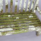 A 20th century teak garden bench, covered in green lichen, height 81cm, width 182cm, depth 70cm.