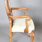 A late 20th century Queen Anne style walnut dining room suite, comprising a set of six chairs, comprising two carvers and four standards, a twin pedestal dining table with two extra leaves, length 322cm, depth 115cm, and a sideboard, width 168cm.
