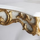 A pair of modern Rococo style white painted and gilt carved wooden console tables with shaped marble tops, height 60cm, width 54cm, depth 40cm.