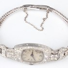 A Gelda platinum cased and diamond set lady's dress wristwatch with signed oval jewelled movement, the silvered dial with Arabic numerals, the case mounted with circular cut diamonds, fitted to a later associated bracelet with foldover clasp, unmarked, total weight 24g, case width 1.6cm, case length 6.3cm.