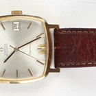 An Omega Automatic gilt metal fronted and steel backed gentleman's wristwatch, circa 1973, the signed movement numbered '36697719', the signed square silvered dial with gilt baton hour markers and date aperture, the case back interior detailed 'MD 162 0060', case width 3.2cm, on a brown leather strap.