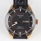 A Tissot PRS 516 Powermatic 80 gilt finished stainless steel cased gentleman's wristwatch, the signed black dial with day and date apertures, the signed case back detailed 'T100430A' and 'MR3 E14 99N', case diameter 4.2cm, on a black leather strap, cased, with outer card sleeve, instruction booklet and warranty card, dated '17/3/2021'.