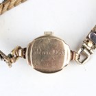 A MuDu 18ct gold rectangular cased lady's wristwatch, the case back detailed '18K 0750', case width 1.1cm, together with a Rotary 9ct gold cased lady's wristwatch on a gilt metal expanding bracelet.