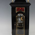 An 18th century gilt brass mounted ebonized bracket timepiece with eight day single fusee movement, formerly quarter repeating on a bell, the backplate with foliate engraved decoration, the 7-inch brass breakarch dial with silvered boss to arch, inscribed 'WM Webster Exchange Alley London', above a silvered chapter ring with black Roman hour numerals and outer Arabic minutes, framing a matt centre with mock pendulum aperture, alarm dial and date aperture, the case with inverted bell top, brass carrying handle and turned finials, above glazed doors and side panels, on a moulded plinth base with bracket feet, height 47.5cm, with pendulum (alterations and restoration).