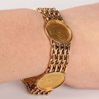 A 9ct gold bracelet, mounted with four Victoria sovereigns, comprising Young Head 1885S with St George and the dragon reverse, Jubilee Head 1887 and two Old Head, 1894S and 1899, on a snap clasp, fitted with a safety chain, total weight 67.2g, length 18.5cm.