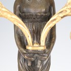 A pair of 20th century French Second Empire style brown patinated and gilt bronze three-light figural candelabra, raised on cylindrical marble bases, height 36cm. Provenance: the property of Michael Godfrey.