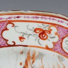 A set of twelve Chinese famille rose export porcelain octagonal soup plates, Qianlong period, each painted with a seated maiden, attendant and boy with landscape beyond, within a pink trellis rim divided by flower vignettes, widths 22.6cm (hairlines and chips to majority).