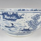 A Chinese blue and white porcelain bowl, mark of Kangxi but late 19th century, painted inside and out with figures and pavilions in landscape, underglaze blue four-character mark to base, diameter 25.6cm, height 10.7cm (rim chips).
